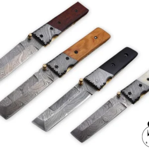 7.5 Inch Damascus Tanto Folding Knife Lot of 4 | Multi Color Handles | 1095 & 15N20 Steel | Liner Lock | Leather Sheaths | Camping & Pocket Carry Set